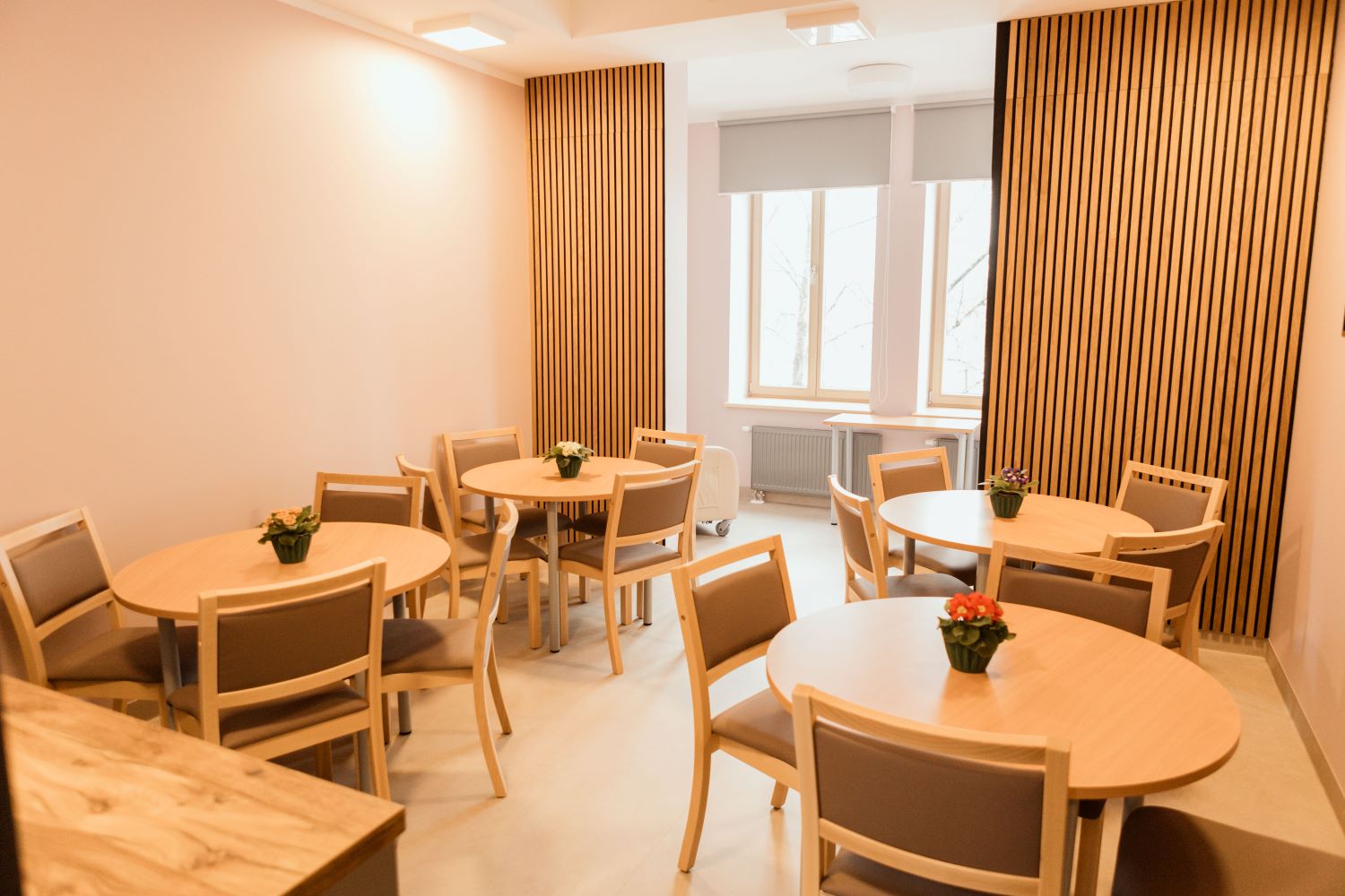 Atjaunotajā A korpusā paredzētas telpas 50 klientiem, kas saņem īslaicīgo sociālās un veselības aprūpes pakalpojumu un ilgstošas sociālās aprūpes un sociālās rehabilitācijas pakalpojumu.